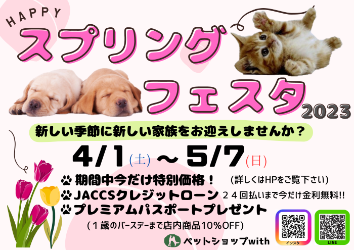 ホーム > ニュース・ブログ > ☆スプリングフェスタ☆彡 ☆スプリングフェスタ☆彡 新しい季節に❀❀❀ 新しい家族をお迎えしませんか(^▽^)/? withイベント情報お知らせ 投稿日:2023年03月30日 勧誘方針について 推奨方針について 勧誘方針について 推奨方針について